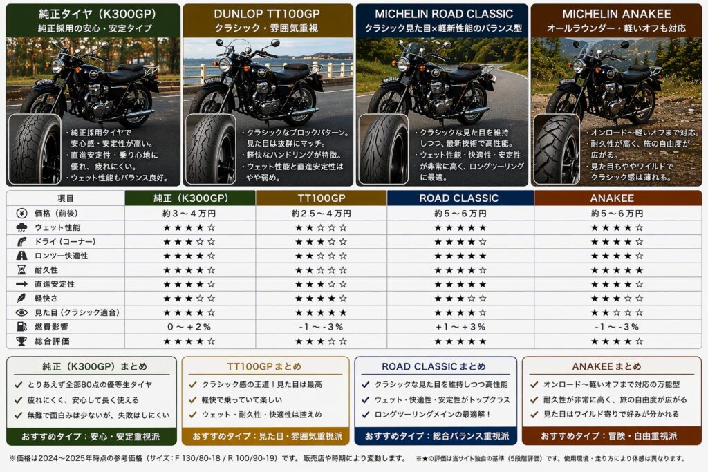 まずメグロK3やW800のタイヤサイズは下記の通りです
